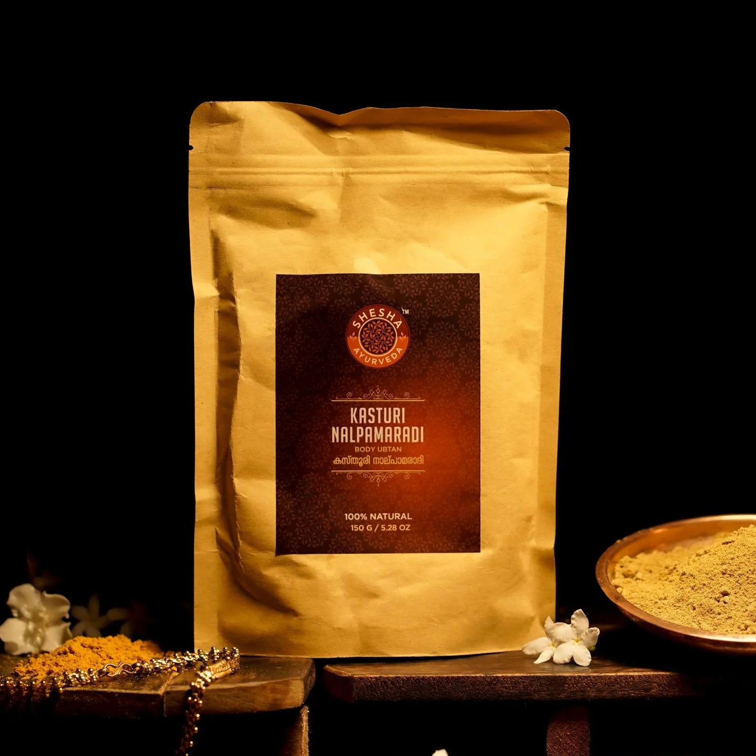 If you'd like to enhance your bathing experience, prior to using the ubtan, massage Shesha Ayurveda Nalpamaradi Thailam onto your body and leave it on for 30 minutes. Afterward, apply the paste of Kasturi Nalpamaradi Skin Brightening Body Ubtan all over your body.